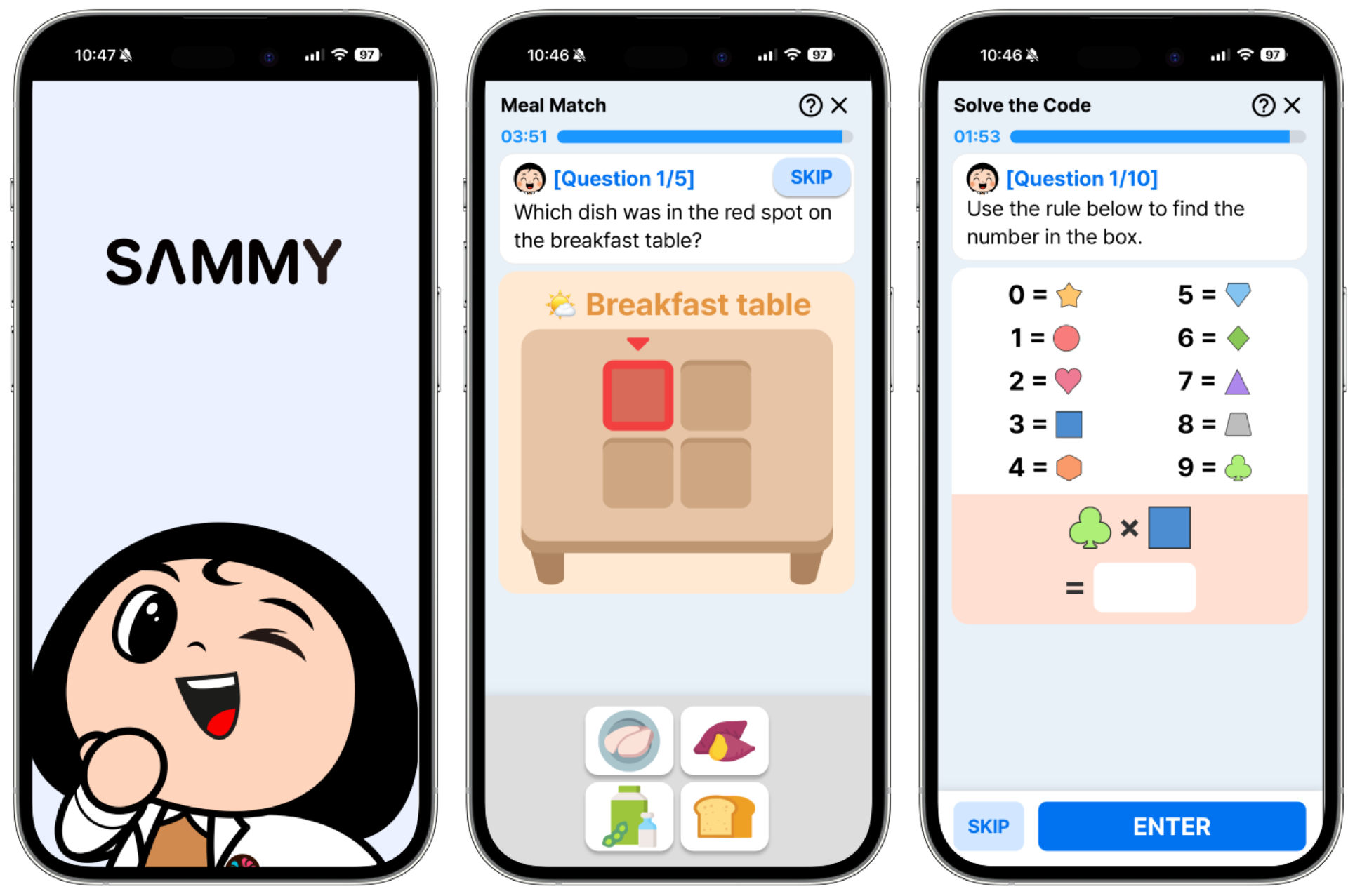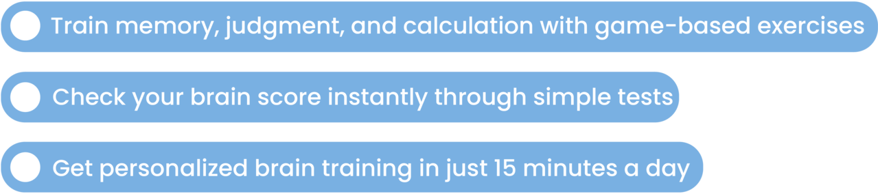 Sammy helps you take care of your brain health through simple tests and fun daily games. Designed for all ages, especially seniors, it allows users to check their brain score, train key cognitive skills, and follow a personalized daily routine.