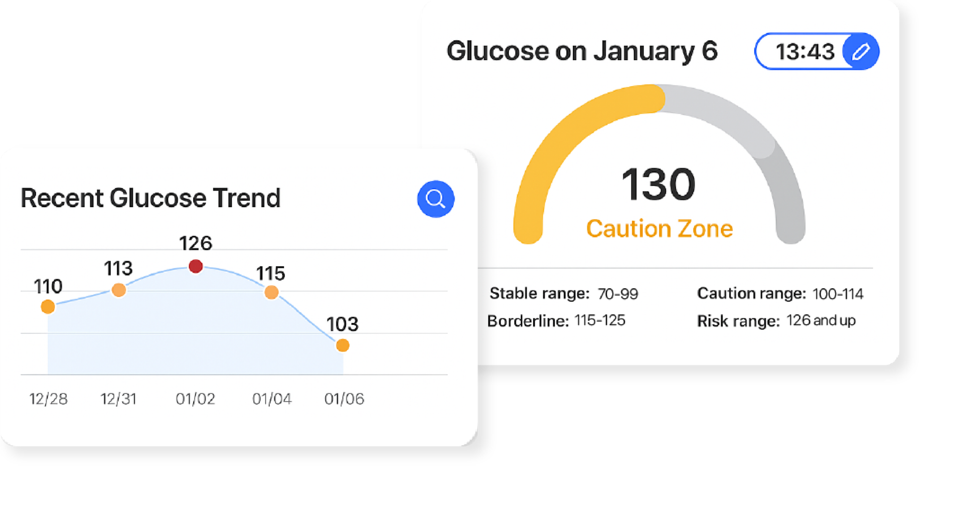Check your blood sugar levels anytime with a simple scan. GlucoCheck instantly categorizes your results into Stable, Caution, Borderline, or Risk Range, so you know exactly where you stand and when to take action.