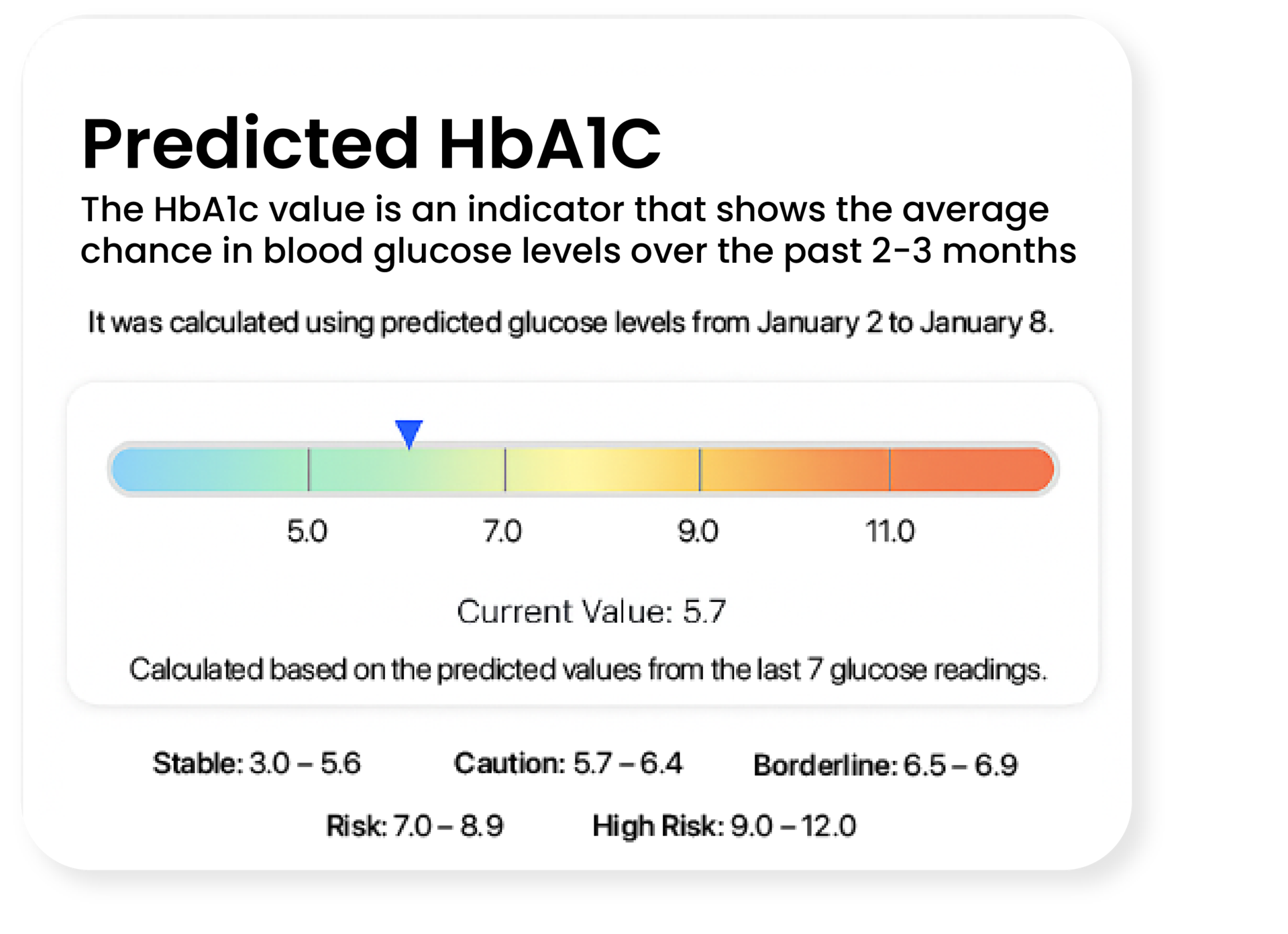 GlucoCheck estimates your predicted HbA1c, the gold standard for long-term blood sugar control. By turning daily checks into a clear 2–3 month view, GlucoCheck helps you track treatment efficacy and stay proactive in managing your diabetes health.